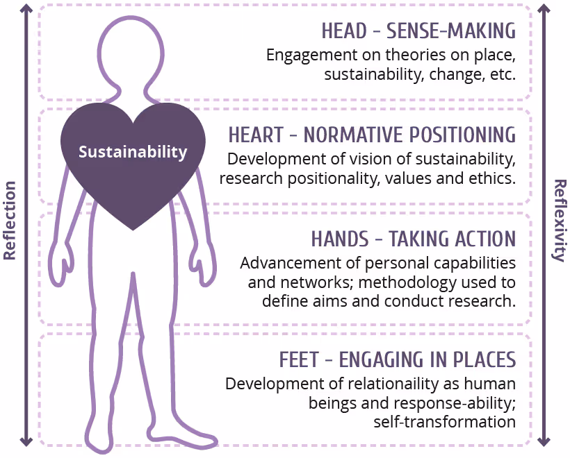 As explained by the authors, the figure portrays the researcher “in all their 'wholeness' and explains the manner in which they carry out research through their place engagement [i.e. engagement to specific contexts], normative assumptions towards sustainability [or other topics if you are working on something else], theoretical positioning and methodological choices.” (Horlings et al. 2020: 479)