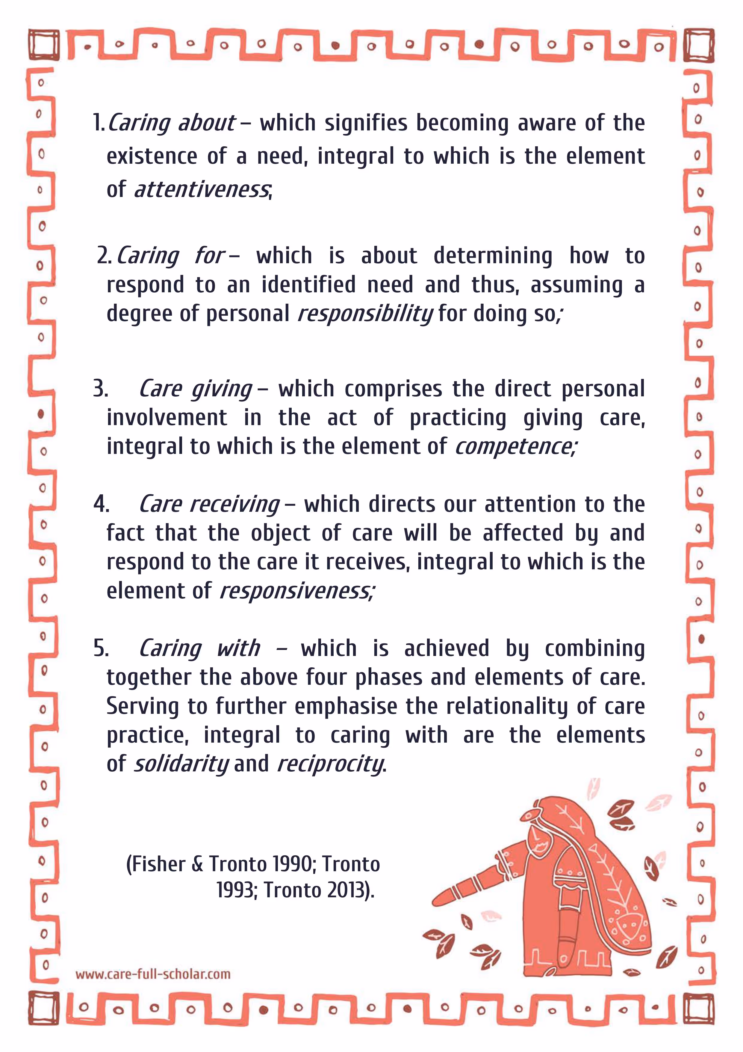 Taking as our starting point Joan Tronto’s theorisation of care ethics (1987, 1993, 2013; see also Fisher and Tronto 1990), in this MOOC we centre our understanding of care-full scholarship around the idea of ‘good’ care as constituting a practice, comprising five interconnected phases of caring and associated ethical elements or moral principles of care. Namely: