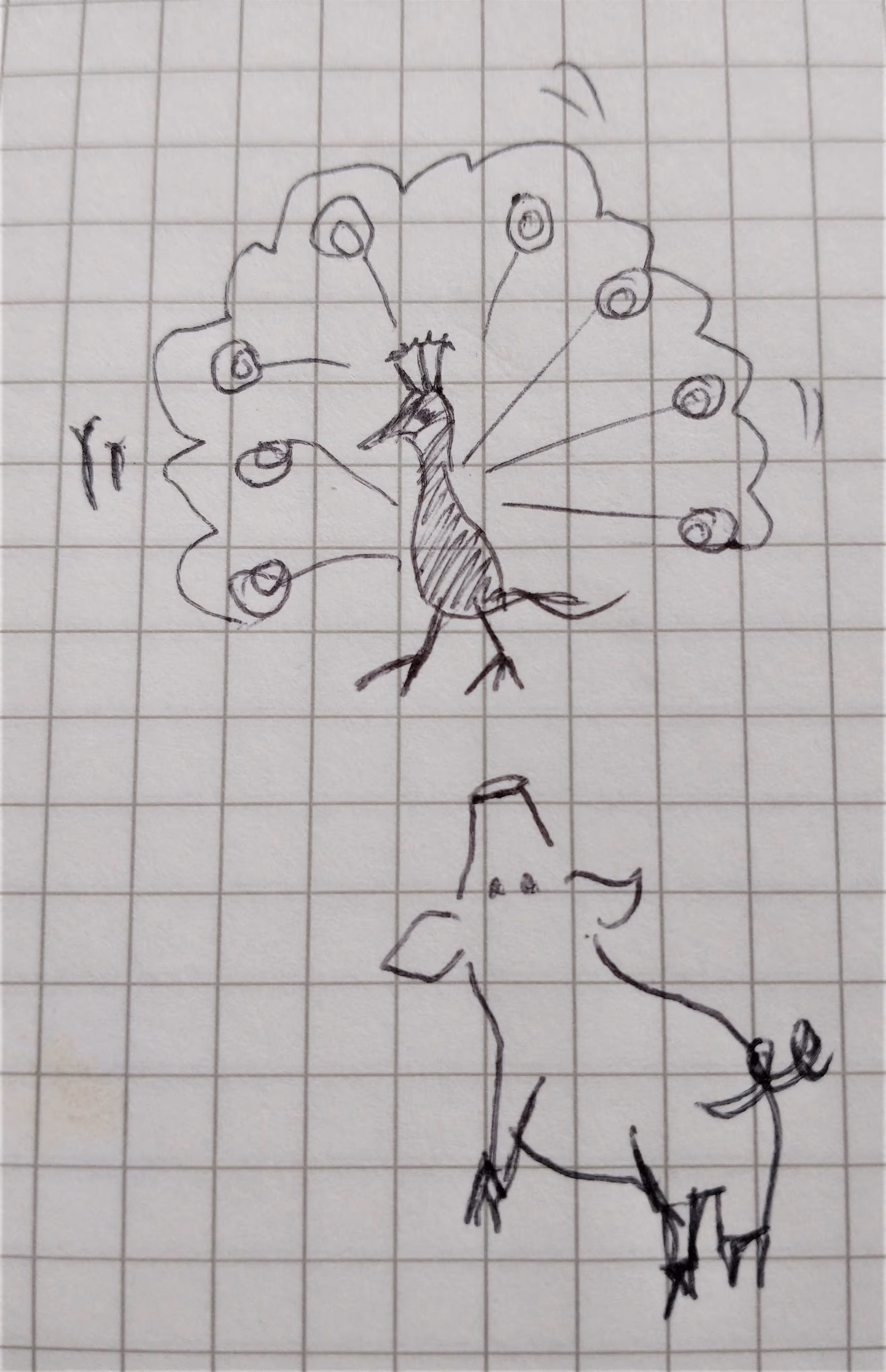 If the gaze of a pig may matter for an exhibitionist peacock, why shouldn’t one take into account […] the fact that the pig, a notoriously curious and sensitive being, might have responded to the former, looked back at it, and might have been affected in such a way that affects the peacock in return? Why not imagine these two beings liberated from pure reproductive motives, and enjoying together an unprecedented, creative, improvised, and queer “becoming together”? (Despret 2013:33)