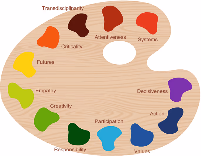 A further list of competences we would like to flag here is one designed for sustainability educators. This framework (‘Educating for a just and sustainable future’), like Tassone et al’s RRI listing on the previous page, also has much synergy with the care ethics discourse (e.g. attentiveness, empathy, values etc). Here, though these are blended with key elements from within the sustainability sciences debate, such as transdisciplinarity, futures, and systems. You can find the full explanation of the competences listed in this website, which is a product of an Erasmus+ initiative.
