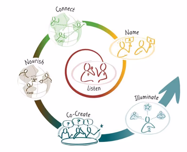 As explained in much fuller detail on their website, the starting point for co-creation with this spiral, is deep listening, which includes setting aside your own knowing and grand plans. By listening and observing this in turn enables greater attentiveness to develop in order to name and identify ‘what is in need of change or starting to change’.