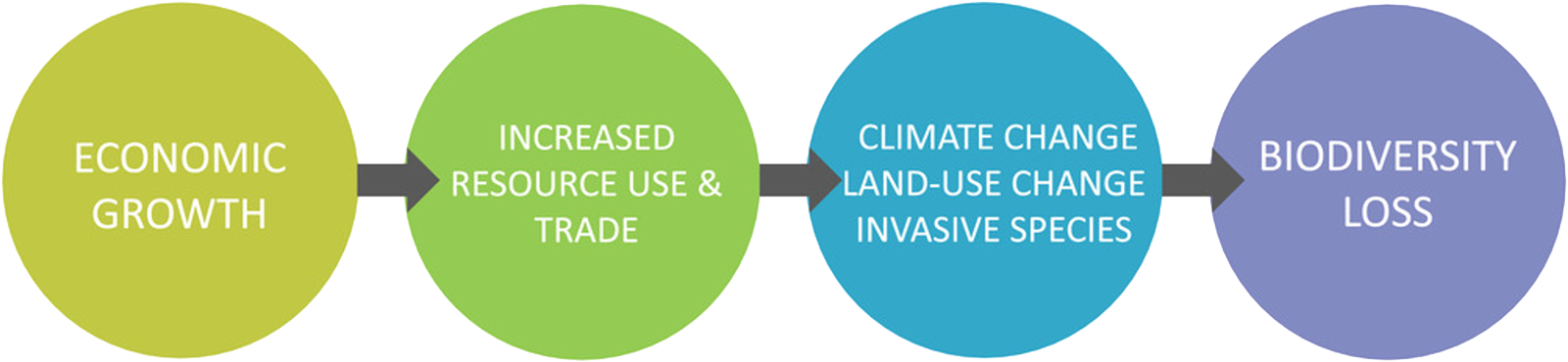 Increasing evidence shows that economic growth leads to greater use of resources and trade, which contribute to higher greenhouse gas emissions, land use change and invasive species. These, in turn, lead to biodiversity loss (Otero, et al., 2020).