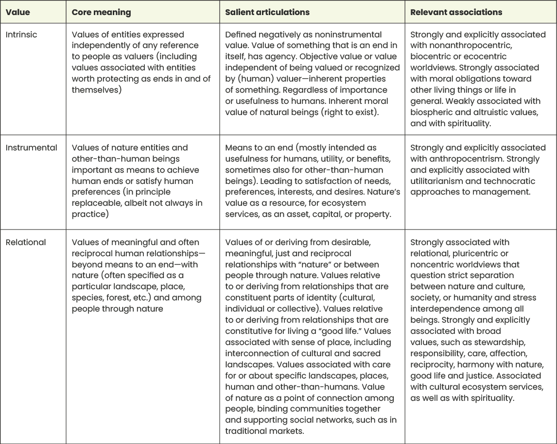 Table 1. from Himes, A., Muraca, B., Anderson, C.B., Athayde, S., Beery, T., Cantú-Fernández, M., González-Jiménez, D., Gould, R.K., Hejnowicz, A.P., Kenter, J. and Lenzi, D., 2024. Why nature matters: A systematic review of intrinsic, instrumental, and relational values. BioScience, 74(1), pp.25-43.